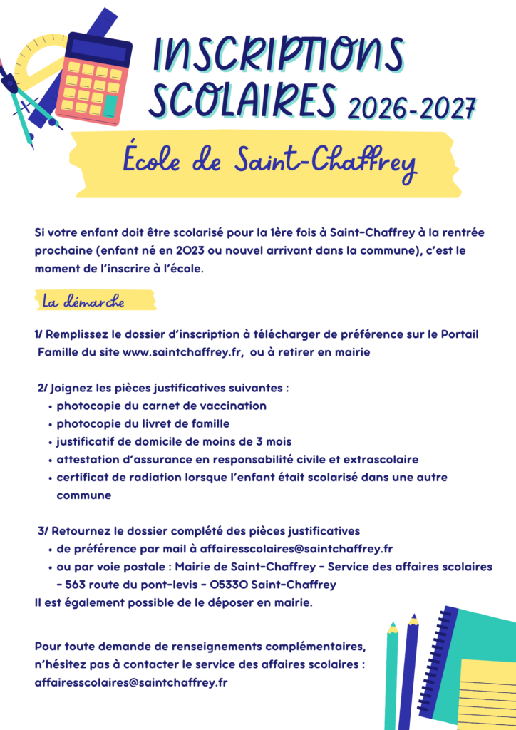 - ou par voie postale : Mairie de Saint-Chaffrey – Service des affaires scolaires – 563 route du pont-levis – 05330 Saint-Chaffrey.